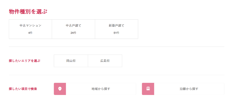 GRAVITYには「新築戸建て」「中古戸建て」などの物件種別や、エリアから物件を絞り込める検索機能が標準搭載されており、サイト利用者は簡単な操作で希望物件に辿りつくことができます。