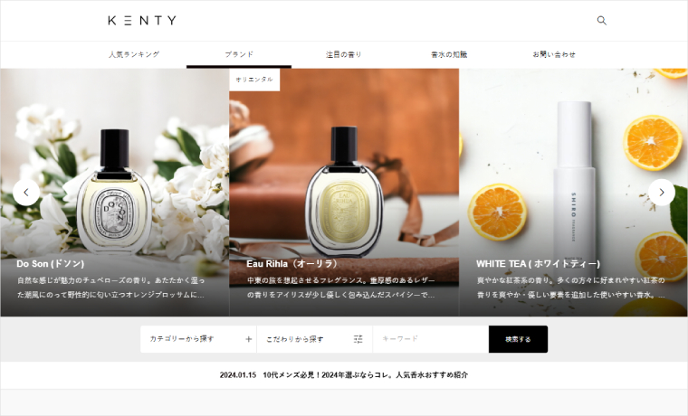 香水のレビューサイト「KENTY(ケンティー香水学校)」様のウェブサイトです。REHUBをご利用いただいています。