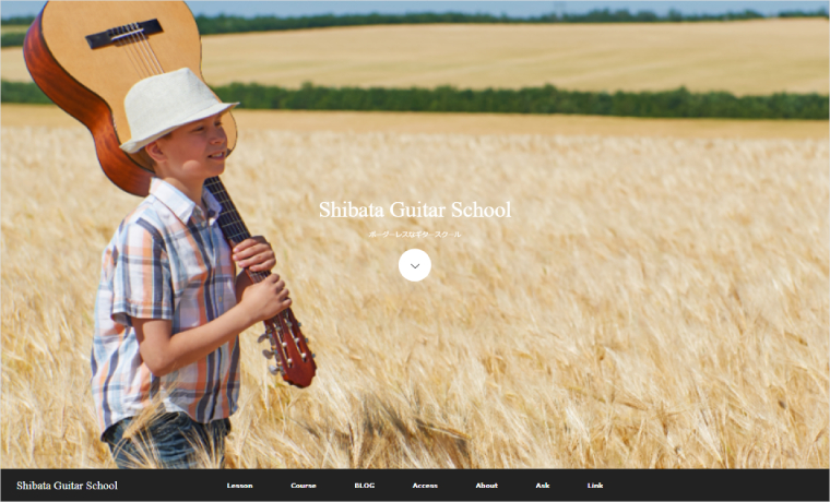 ファーストビューには、映画のワンシーンを彷彿とさせるような印象的なスライダー画像が使用されており、訪問者の目を惹きつけます。シンプルでありながらもカッコいいビジュアル構成により、Shibata Guitar School様の世界観がしっかりと伝わってきます。
