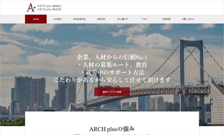 全体を通じて、「ARCH plus」様の企業理念と信頼性が的確に表現された、完成度の高いウェブサイトに仕上がっております。ぜひご参考にご覧ください。