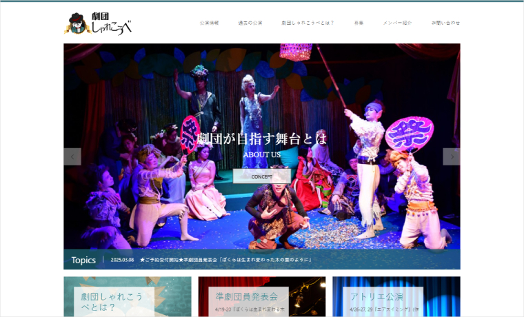 トップページのヘッダーには、劇団の稽古風景などを収めた動画が配置されており、訪問者に劇団の世界観や活気ある雰囲気を直感的に伝える構成となっています。動画によるダイナミックな演出が、劇団の個性と魅力を一層引き立てています。