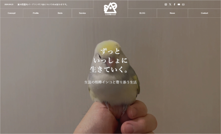 トップページのヘッダーに配置された動画には、愛らしいインコの自然な様子が収められており、訪問者の心を和ませてくれます。動画の活用により、視覚的な訴求力が高く、訪問者の興味を引きつける構成となっています。動画以外に静止画のスライダーにすることも可能です。