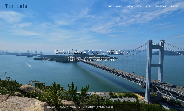 トップページには倉敷の街並みや、販売されているタータン柄の画像が配置され、サイトの世界観を創り出しています。ヘッダーコンテンツの切り替わるアニメーションもスタイリッシュな印象を与えます。