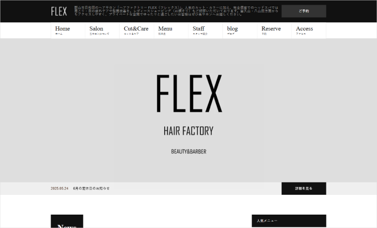 福島県郡山市の完全個室美容室「HAIR FACTORY FLEX」様のウェブサイトです。スタイリッシュかつ機能的なデザインが特徴のBeautyをご利用いただいています。