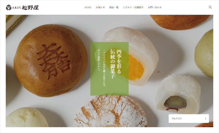 ファーストビューでは、縦書きのキャッチフレーズと美しい和菓子の写真を組み合わせ、訪れる人に魅力を伝えています。四季折々の素材を活かした和菓子は、まさに日本の伝統文化そのもの。丁寧な職人技と地域に根ざした歴史を感じさせる構成となっています。