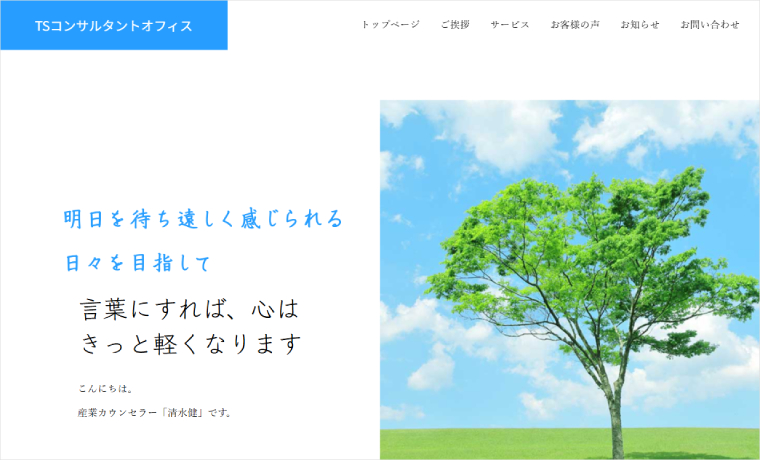 産業カウンセラーとして、悩んでいる人に安心感を与えたい、心を晴れやかにしたいという思いから、サイトのコンセプトは「青空と緑」です。